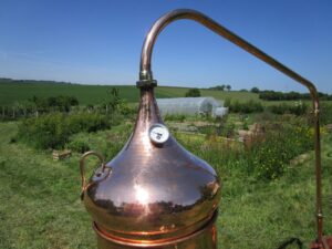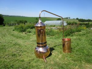 C’est un superbe alambic à colonne, de 100 litres, en cuivre. Ça fait vraiment alchimiste, J’adore !! Et en plus d’être magnifique, il va me permettre de faire de plus grandes quantités d’hydrolat (c’était un peu l’objectif du départ).