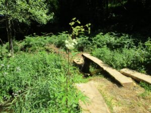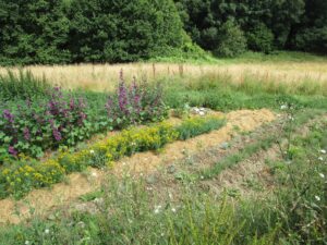 Sur les photos on voit les plantes cultivées au milieux de leurs voisines sauvages, une magnifique reine des prés auprès du pont qui a autant de valeur symbolique que pratique pour moi et le menhir aux premiers rayons du soleil