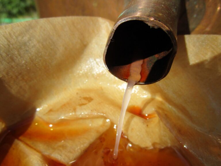 Sur les photos, on voit bien l’huile essentielle qui coule sur les côtés et l’hydrolat au milieux et ensuite l’huile essentielle surnage sur l’hydrolat. Pendant toute la distillation j’ai eu Georges le crapaud qui m’a accompagné, sortant sa tête quand…