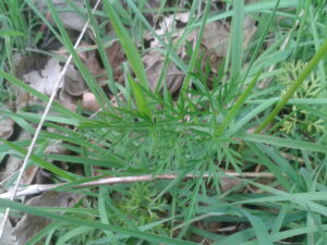 C’est la période où l’on mange les plantes sauvages. Dans le champ j’ai de la noisette de terre (Conopodium majus), elle fait partie de la famille des apiacées, comme la carotte ou le persil, avec une feuille très découpée.