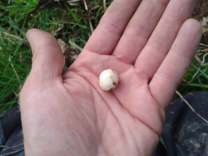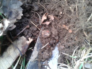 - La noisette dans la terre, pas toujours facile à trouver, la tige s’en détache facilement. Il faut mettre un peu les mains dans la terre et émietter doucement. On se retrouve avec la noisette qui roule entre les doigts.