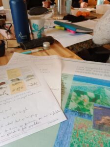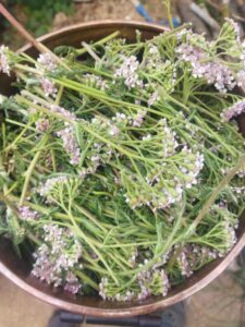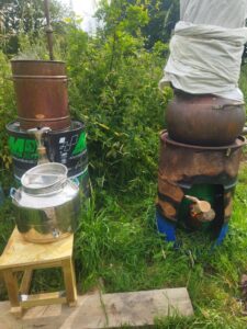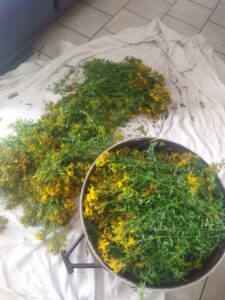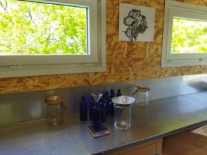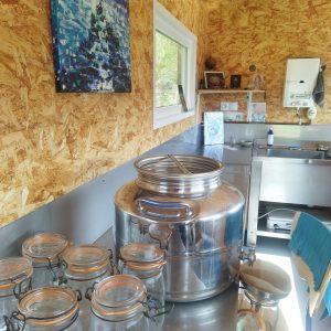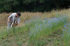 Pour commencer, il faut savoir que tout est fait par moi même et mes petites mains. Mais aussi mes bras et mes jambes 😉 . Je suis en 0% tourbe. Tout le travail du sol, le désherbage et les cueillettes sont fait à la main. Je fais mon bois pour la distillation. Et surtout, mes produits ne touchent JAMAIS de plastique ! Oups, je mens un peu là, j’ai une maryse pour racler les bols de préparation des baumes et j’ai des plaques de semis. Ha oui, je m’occupe aussi de la compta, de la commercialisation, de l’administratif, les engagements auprès des différents réseaux, les formations …